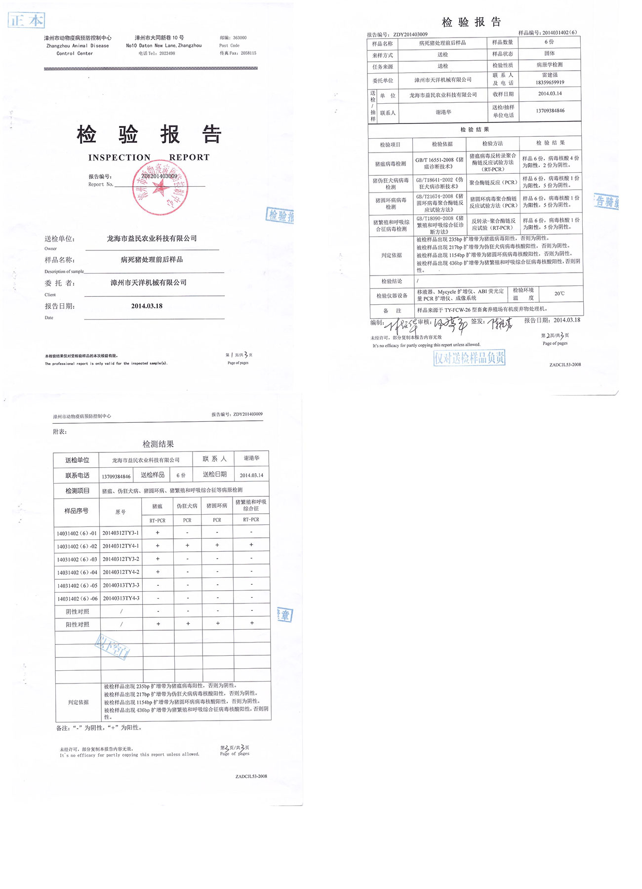 漳州市動物疫病預(yù)防控制中心檢驗(yàn)報告--病死豬處理前后樣本